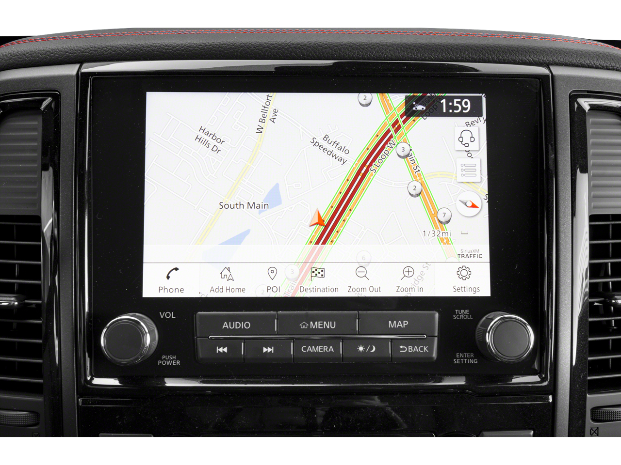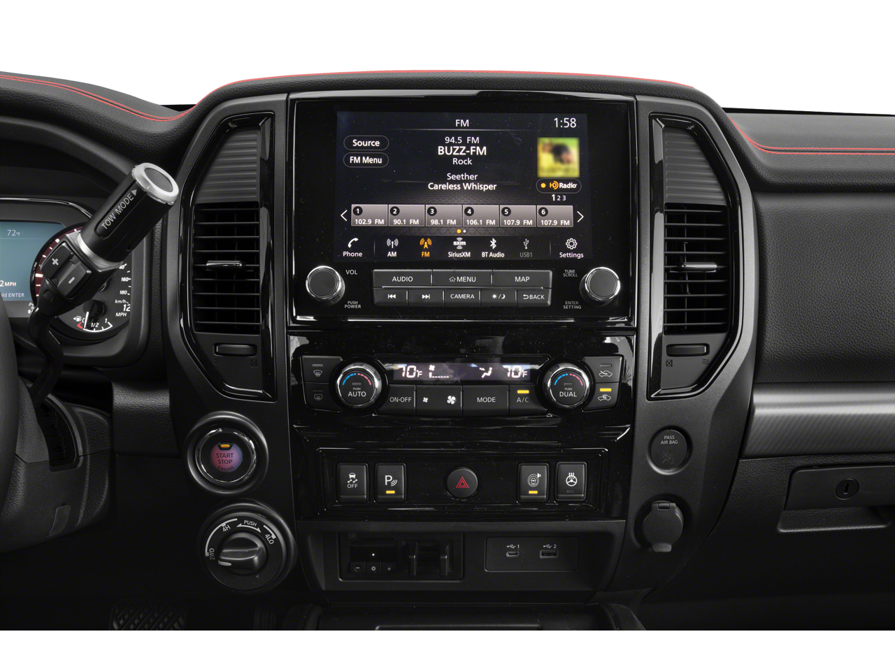 - Radio: NissanConnect w/Navigation -inc: 9" touchscreen display, 6 speakers, Apple CarPlay, Android Auto, HD Radio, SiriusXM satellite radio, SiriusXM Traffic, SiriusXM Travel Link w/weather, fuel prices, movie listings, stock info, TomTom weather, Nissan door to door navigation w/3D building graphics and satellite imagery, online POI search, over-the-air map updates and online premium traffic information, 2-USB (1 type A, 1 type C) connection ports for iPod interface and other compatible devices, 2 USB A ports (charge only), Bluetooth hands-free phone system, streaming audio via Bluetooth, hands-free text messaging assistant, Nissan Connect services, WiFi hotspot, Nissan voice recognition for navigation and audio, Siri Eyes Free and follow me home function